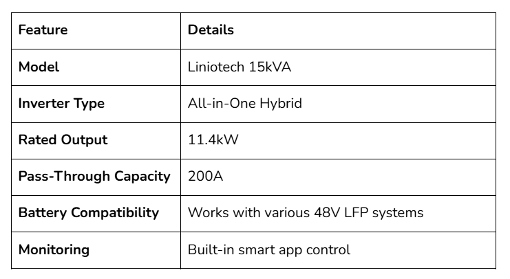 Here’s a quick breakdown of the Liniotech 15kVA Hybrid Inverter’s specifications and features: