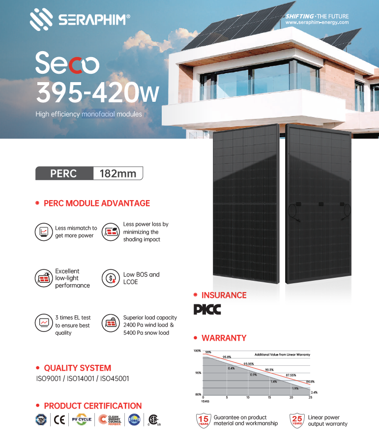 Seraphim 405W High-Efficiency Monofacial Solar Panel – PERC 182mm | Black Module | UL & IEC Certified