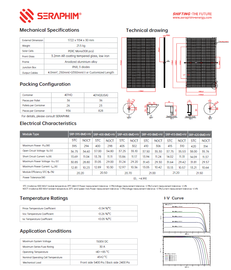 Seraphim’s SRP-BMD-HV 182mm monofacial PERC series delivers exceptional performance, superior durability, and industry-leading reliability. Engineered with advanced manufacturing and tested through a strict ISO-certified quality assurance system, the Seraphim 405W module offers top-tier efficiency, excellent low-light response, and long-term power stability backed by a 25-year linear power output warranty.