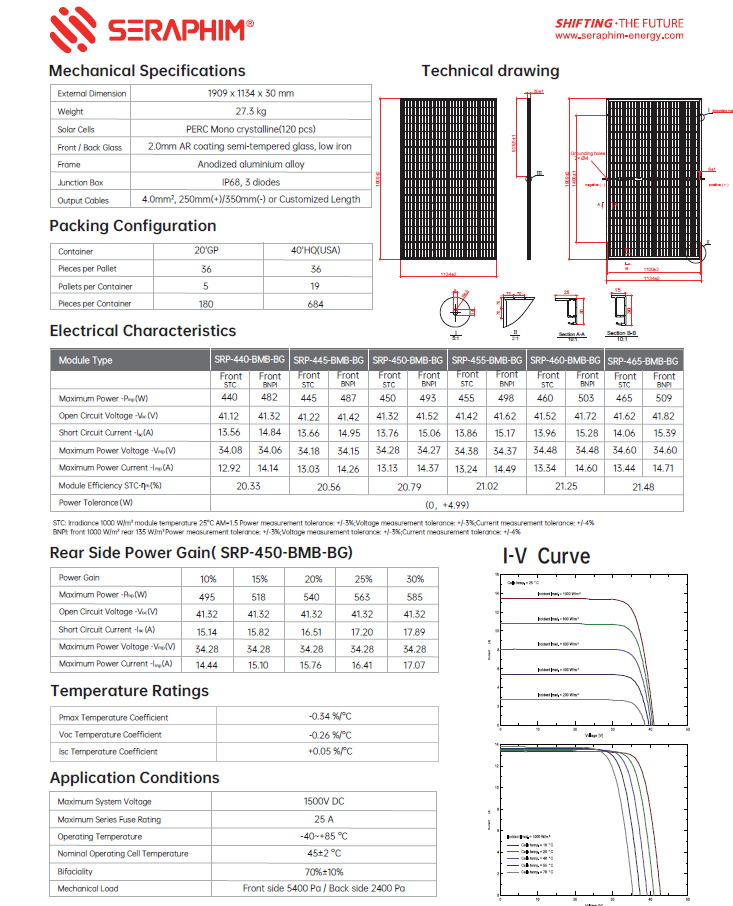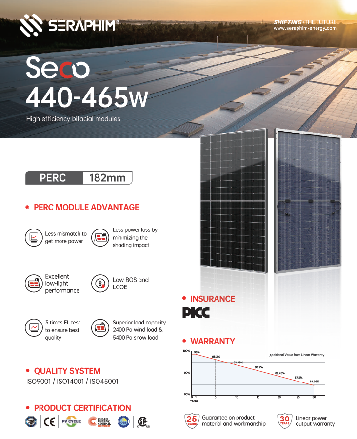 Seraphim Solar, a Tier-1 global manufacturer, delivers high-efficiency bifacial modules engineered for superior performance, durability, and long-term reliability. With advanced 182mm PERC cell technology, exceptional low-light sensitivity, and rigorous testing standards, the Seraphim 450W module is an ideal solution for residential, commercial, and large-scale installations.