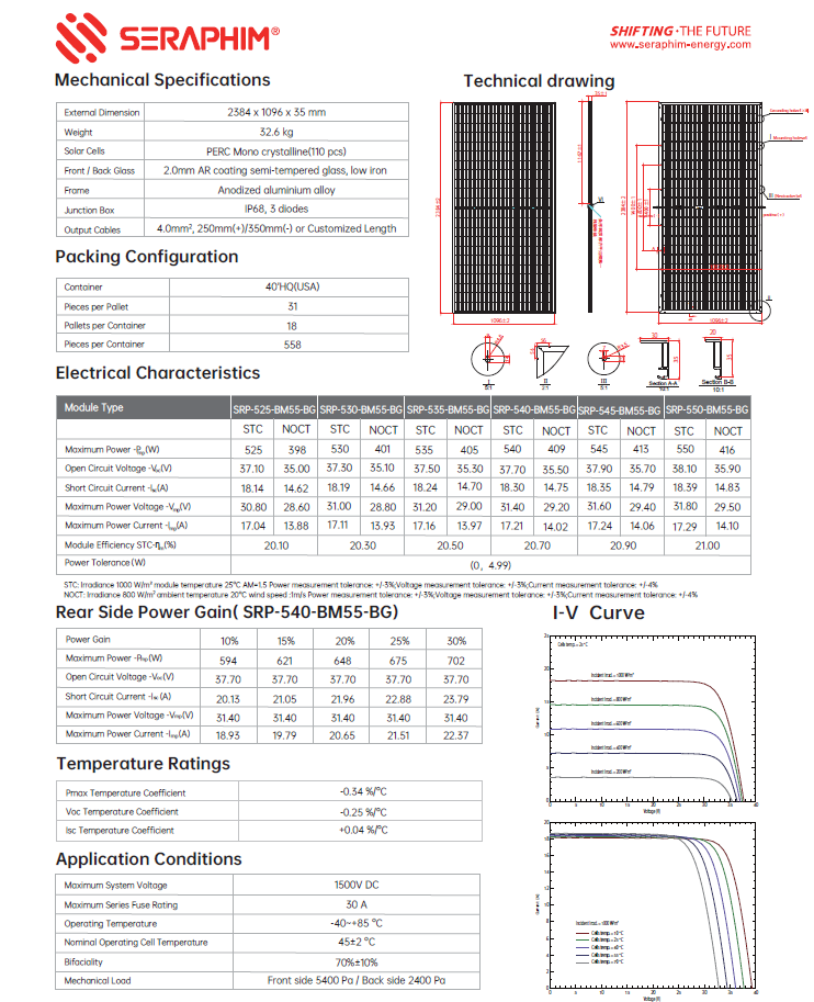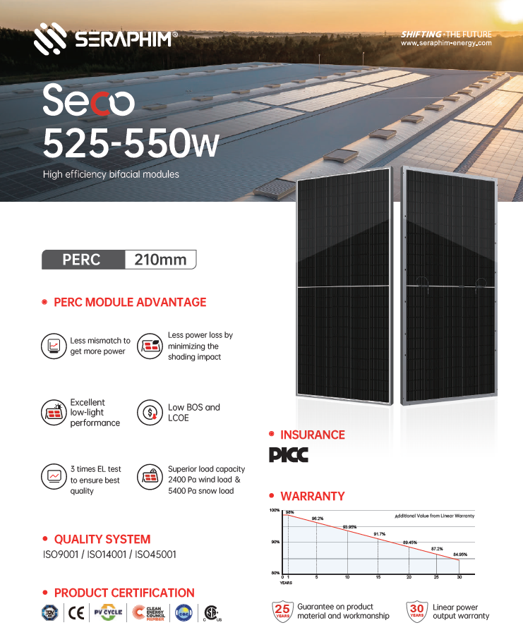 The Seraphim 550W Bifacial High-Efficiency Solar Panel delivers industry-leading performance with large-format 210mm half-cut PERC cells, dual-glass durability, and exceptional rear-side gain. Backed by a 25-year product warranty and 30-year linear power warranty, this Tier-1 module is ideal for residential, commercial, and utility-scale installations.